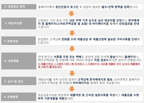 신청 접수 기간이 끝나면 주금공에서 낮은 주택 가격순으로 대상자를 선정하고, 이후 콜센터(☎ 1688-8114)에서 전화로 상담한 뒤 대출 심사가 시작된다. 실제 대출은 10월부터 공급될 예정이다.