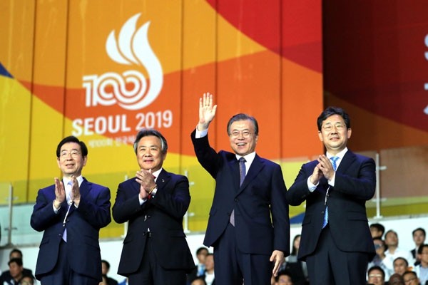 ▲ 문재인 대통령(오른쪽 둘째)이 4일 서울 잠실종합운동장에서 열린 제100회 전국체육대회에 참석해 관객들을 향해 손을 흔들며 인사하고 있다. 왼쪽부터 박원순 서울시장, 이기흥 대한체육회장, 문 대통령, 박양우 문화체육관광부 장관.