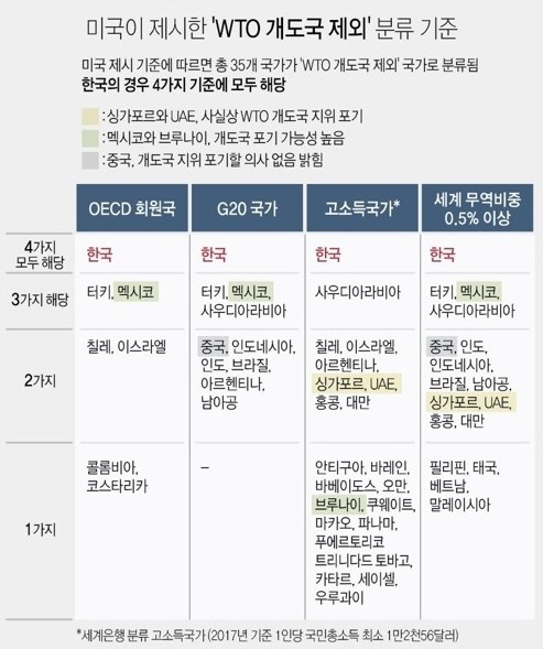 도널드 트럼프 미국 대통령은 지난 7월 26일 '비교적 발전한 국가'가 WTO에서 개발도상국 지위를 인정받는 것에 문제를 제기하고 90일 시한 내 WTO가 진전된 안을 내놓지 못하면 해당 국가에 대한 개도국 대우를 일방적으로 중단하겠다고 밝힌 바 있다.