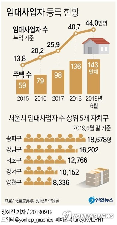 6월 말 기준 전국 등록 임대사업자는 모두 44만명, 임대주택은 143만채였다. 2015년 말 13만8천명, 59만채와 비교하면 3년 반 만에 각 3.19배, 2.42배로 불었다.