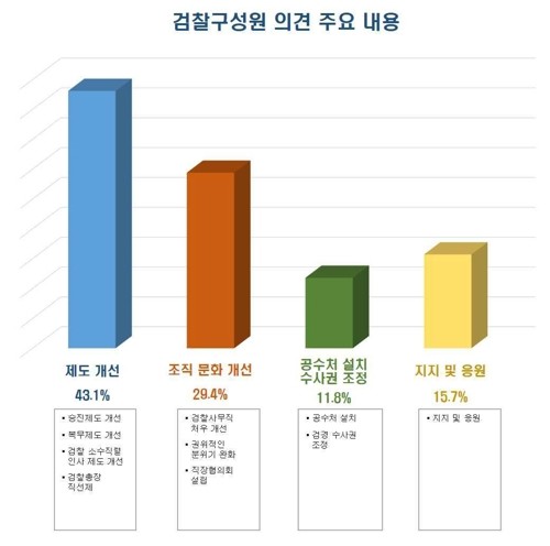 검사와 직원 등 검찰 내부 구성원의 제안도 55건 접수됐다. 법무부는 내부에서는 검찰 일반직 인사제도 개선, 조직문화 개선, 검찰개혁, 공수처 설치 등 순으로 의견이 나왔다고 설명했다.
