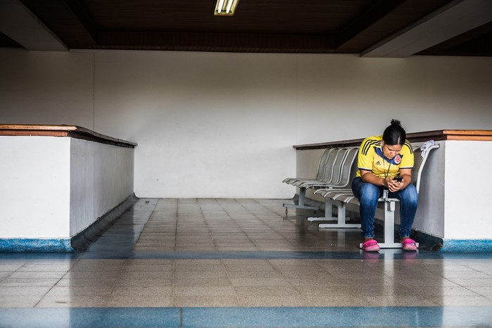 ▲ 콜롬비아 산안드레스공항의 한 여성 스텝이 텅빈 탑승구에서 대기석에서 휴대폰을 검색하고 있다/ 사진= 게티이미지.