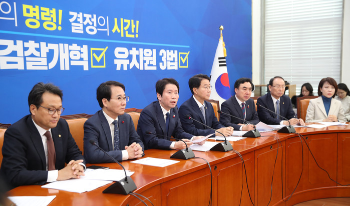 더불어민주당 이인영 원내대표가 12일 서울 여의도 국회에서 열린 정책조정회의에서 발언하고 있다.