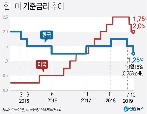 한은은 2016년 6월 기준금리를 1.25%로 내리고 나서 2017년 11월과 지난해 11월 0.25%포인트씩 올렸다가 올해 7월 0.25%포인트 내렸다.