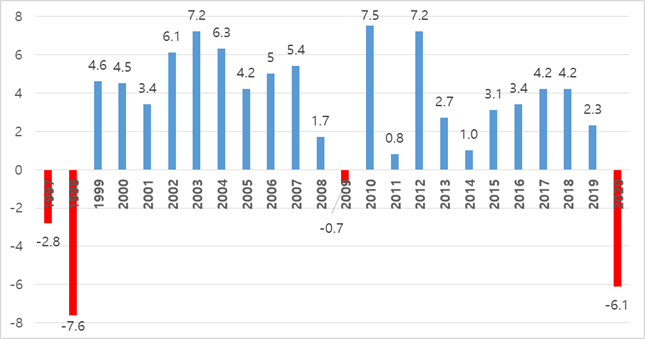 | ▲ 연도별 태국 경제성장률(GDP) 추이표/ 표= KOTRA 방콕무역관 제공. |