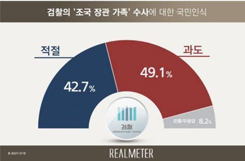 | ▲조국 가족 검찰 수사…과도 49.1% vs 적절 42.7% [리얼미터 제공] |