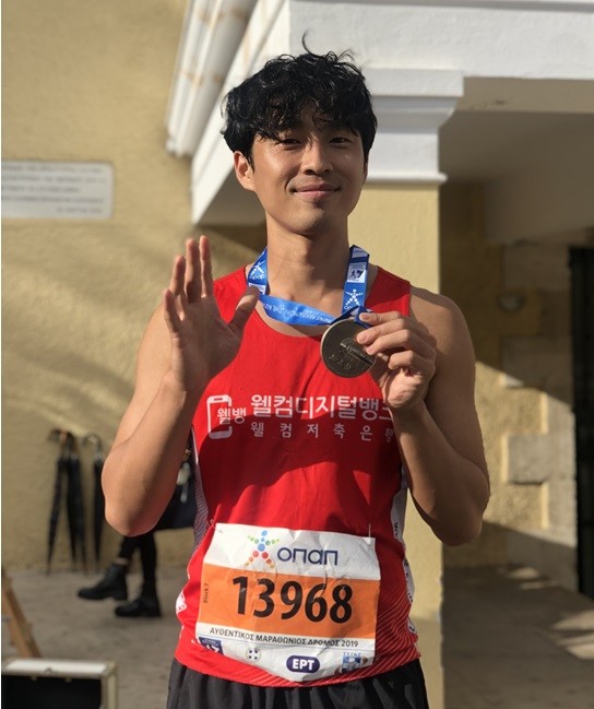 ▲ 지난해 11월 열린 아테네 마라톤 대회에 참가한 한동호씨. 웰컴저축은행 제공