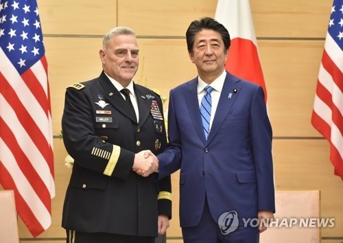 아베 신조 일본 총리(R)가 미국 합참의장과 악수하고 있다. 2019년 11월 12일 일본 도쿄의 아베 총리실에서 회담에 앞서 마크 밀리