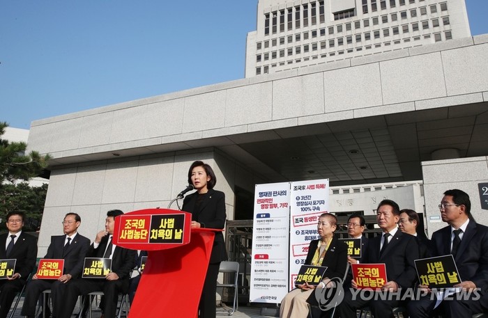 나 원내대표는 이날 서울 서초동 대법원 앞에서 문재인 정권 사법농단 규탄현장 국정감사대책회의를 열고 조국 전 민정수석 동생에 대한 구속영장 기각 결정은 장악된 사법부가 보이는 사법 농단의 결정판이라 밝혔다.