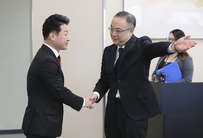 한일 수석대표는 회의장 입구에서 가볍게 웃으며 악수했다. "굿모닝"이라고 짧은 인사도 주고받았다. 일측 대표단은 한측이 회의장에 착석한 이후 자리에 앉는 공손한 태도를 보였다.