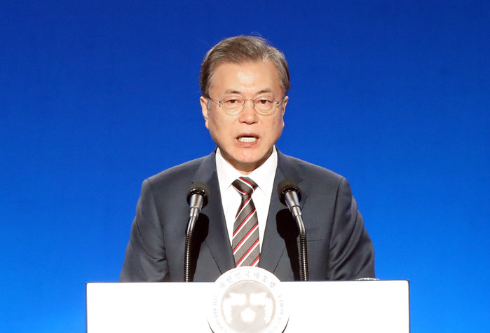 문재인 대통령이 9일 포항 규제자유특구 GS건설 투자협약식이 열린 포항실내체육관에서 발언하고 있다. 연합뉴스 제공 |
