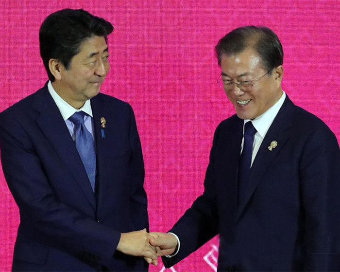 ▲문재인 대통령과 아베 일본 총리가 2019년 11월 4일 방콕 임팩트 포럼에서 열린 역내포괄적경제동반자협정(RCEP)에서 악수하고 있다. 연합뉴스 제공 |