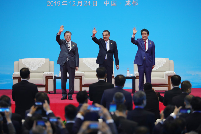 문재인 대통령과 리커창 중국 총리, 아베 일본 총리가 24일(현지시간) 쓰촨성 청두 세기성 국제회의센터에서 열린 정상회의 전 기념촬영을 하고 있다. 2019.12.24 연합뉴스 제공