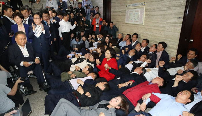 ▲ 4월26일 당시 국회 회의실 앞에 드러누워 진입 막는 자유한국당. 연합뉴스 제공