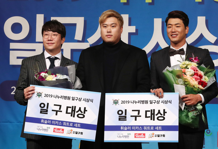 ▲ SK 와이번스 김광현(오른쪽)과 KIA 타이거즈 양현종(왼쪽)이 6일 오전 서울 강남구 리베라호텔에서 열린 '2019 나누리병원 일구상' 시상식에서 공동 대상을 수상한 뒤 류현진과 기념촬영 하고 있다. 연합뉴스 제공