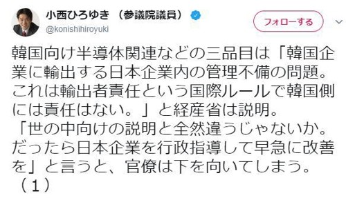 고니시 히로유키(小西洋之, 무소속) 일본 참의원 의원은 일본 정부가 반도체 관련 품목의 한국 수출 규제를 강화한 것이 자국 기업의 잘못 때문이라는 글을 4일 트위터에 올렸다.