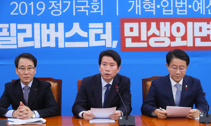 | ▲ 더불어민주당 이인영 원내대표(가운데)가 5일 국회에서 열린 정책 조정회의에서 발언하고 있다. 연합뉴스 제공 |
