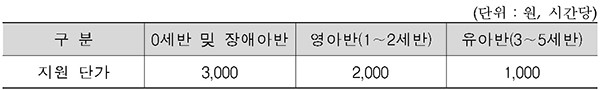 또 이와 별도로 신설되는 연장보육료는 오후 5시 이후 시간당 단가를 정해 지원하는데 12개월 미만은 시간당 3000원, 영아반 2000원, 유아반은 1000원이다.