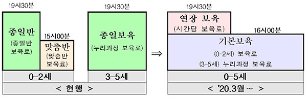 내년 3월부터 보육에 대한 국가 지원을 더욱 강화하기위해 어린이집 보육시간을 구분하고 연장보육 전담교사를 배치한다.