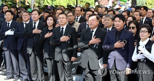 ▲ 박정희 전 대통령 40주기 추도식 자유한국당 황교안 대표와 나경원 원내대표 등이 26일 서울 동작구 국립서울현충원에서 열린 박정희 전 대통령 40주기 추도식에서 국기에 경례하고 있다. |