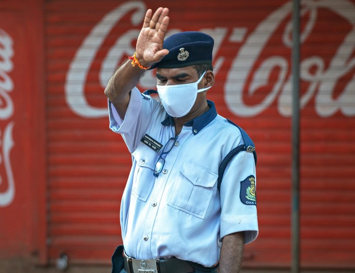 ▲한 경찰관이 인도 뉴델리 시내 전통시장 입구에서 코로나19로 출입을 통제하고 있다/ 사진= 게티이미지.