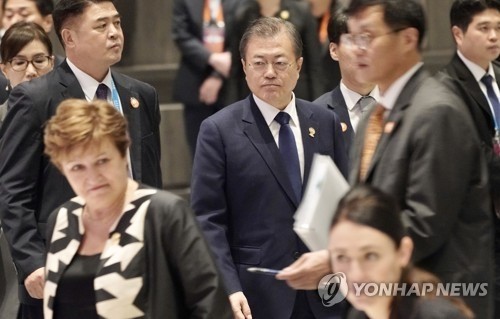 ▲ 지속가능발전 특별오찬 참석한 문 대통령 문재인 대통령이 4일 방콕 임팩트 포럼에서 아세안+3 정상회의 후 열린 지속가능발전 관련 특별오찬에 입장하고 있다.