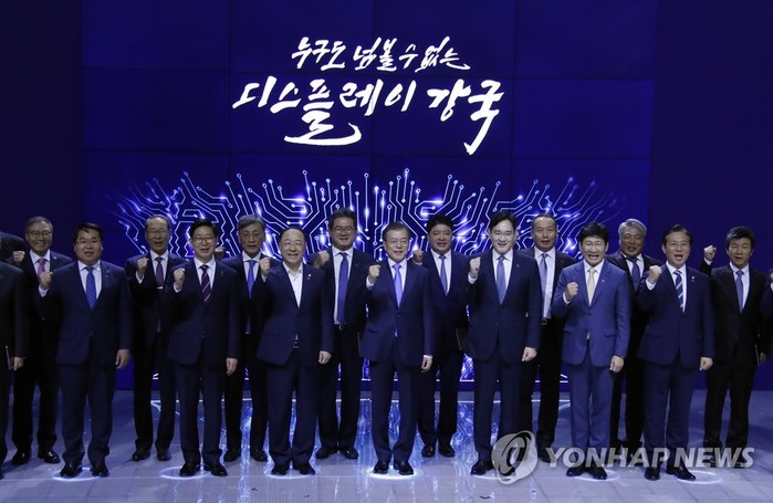 문재인 대통령이 10일 오전 충남 아산시 삼성디스플레이 아산공장에서 열린 삼성디스플레이 신규 투자 및 상생협력 협약식에서 상생협력 MOU 서명자, 홍남기 경제부총리, 이재용 삼성전자 부회장 등과 함께 '디스플레이 강국 파이팅!'을 외치고 있다. |