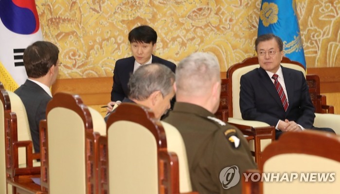 | ▲ 문재인 대통령이 11월 15일 청와대에서 마크 에스퍼 미국 국방장관과 만나고 있다. |