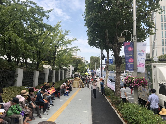 시위 시작 전 대검찰 청 앞은 마치 ‘공동경비구역(판문점 JSA)’ 방불케 했다. 대검찰청 바로 앞 인도(서초역 6번 출구 방향)는 ‘검찰을 지지・윤석열 총장 지지・조국 사퇴’를 주장하는 시위대가 진을 치고 있었다. 도로 건너 반대편 인도(서초역7번 출구)에는 ‘검찰개혁・조국지지’를 주장하는 시위대가 집회를 준비하고 있었다. 경찰은 대검찰청 문 앞을 중심으로 바리케이트를 설치해 행인들의 출입을 통제했다. 조국 사퇴를 주장하는 시위대는 확성기를 통해 “조국은 사퇴하라’라고 강력하게 촉구했다. 이 소리는 일대를 가득 체워 자칫 과열 시위를 유발하는 게 아닐까 하는 걱정을 일게 만들었다.