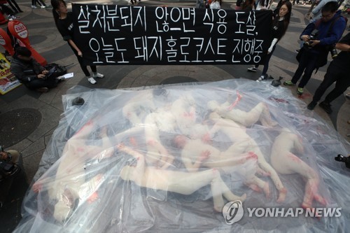 아프리카돼지열병 확산에 따른 살처분이 계속되는 가운데 6일 오후 서울 명동에서 동물해방물결 회원들이 살처분 당하는 돼지의 고통을 알리고 탈육식 동참을 호소하는 퍼포먼스를 하고 있다.