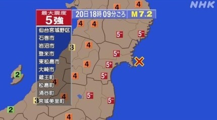 ▲ 20일 일본 미야기현 인근과 도호쿠(東北) 지역에 발생한 지진 강도 현황/ 사진= NHK 갈무리.