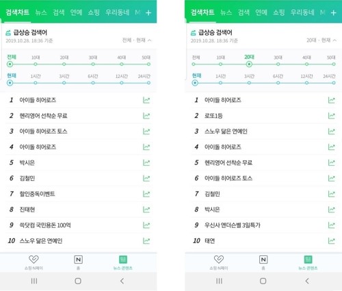20대 사용자에게는 해당 연령대가 많이 찾은 검색어 차트가, 40대 사용자에게는 동년배 인기 검색어가 먼저 보이는 방식이다. 이전에는 전체 연령대의 급상승 검색어가 기본으로 떴다.
