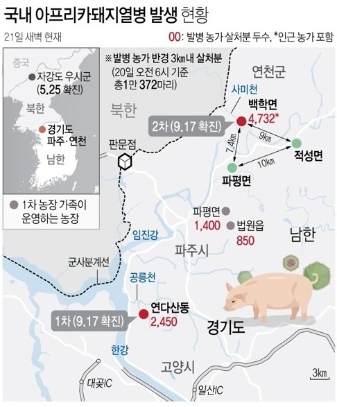 21일 농림축산식품부에 따르면 전날 오전 파주시 적성면에서 돼지 2마리가, 파평면에서 돼지 1마리가 각각 폐사했다는 신고가 접수됐다.