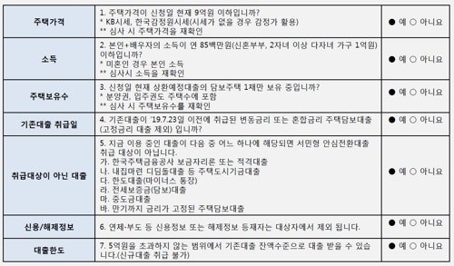 부부 합산 연 소득이 8천500만원 이하인 1주택자만 신청할 수 있다. 단 혼인 기간 7년 이내의 신혼부부나 2자녀(만 19세 미만) 이상 가구는 부부 합산 소득 1억원까지 가능하다.