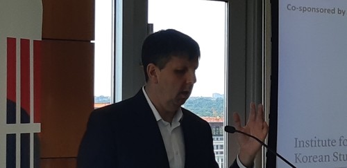 ▲ 북한경제 세미나에서 기조연설하는 리퍼트 前대사 마크 리퍼트 전 주한미국대사가 워싱턴DC에세 조지워싱턴대 한국학연구소가 개최한 북한경제 관련 세미나에서 기조연설을 하고 있다. |