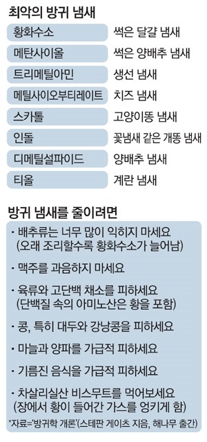가장 독한 방귀는 종종 식품 속 아미노산(단백질 구성 요소)을 분해한 결과로 만들어지는데, 특히 콩과 치즈, 육류에 아미노산이 많다. 만약 저녁식사로 독한 방귀를 뀔 수있는 메뉴를 골랐다면 한밤중에 아내에게 '악취폭탄'을 선물할 수 있다. 이럴 경우 보통 손바닥을 컵 모양으로 모아서 그 안에 방귀를 뀌고 냄새가 아내의 예민한 코쪽으로 가지 않도록 배려하는 게 에티켓이라고 할 수 있겠다. 일반적으로 누구나 본인의 방귀 냄새를 싫어하지는 않지만 남의 방귀는 싫어한다. 특히나 밀폐된 장소나 침대에서 이불을 뒤집어쓴 채 방귀를 뀐다면 더욱 그렇다. 그것은 처음부터 우리가 해로운 세균이 들어 있을지 모를 배변(똥)을 피하게끔 반응하는 본능이 방귀를 뀔 때도 역시 작용하고 있다.