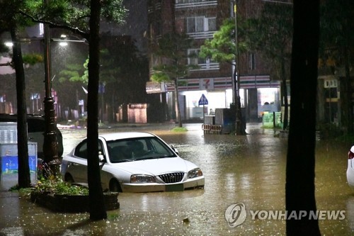제18호 태풍 '미탁'으로 강원 삼척에 400㎜의 폭우가 쏟아져 삼척 시내 도로가 물에 잠겼다.