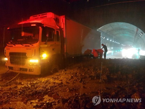 3일 새벽 제18호 태풍 '미탁'으로 400㎜가 넘는 폭우가 쏟아진 강원 삼척시 근덕면 장호터널 인근에서 토사 유출로 인해 대형 트럭이 고립돼 소방대원들이 펌프차를 이용해 트럭을 흙더미에서 빼내는 작업을 하고 있다.