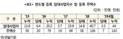 6월 말 기준 전국 등록 임대사업자는 모두 44만명, 임대주택은 143만채였다. 2015년 말 13만8천명, 59만채와 비교하면 3년 반 만에 각 3.19배, 2.42배로 불었다.