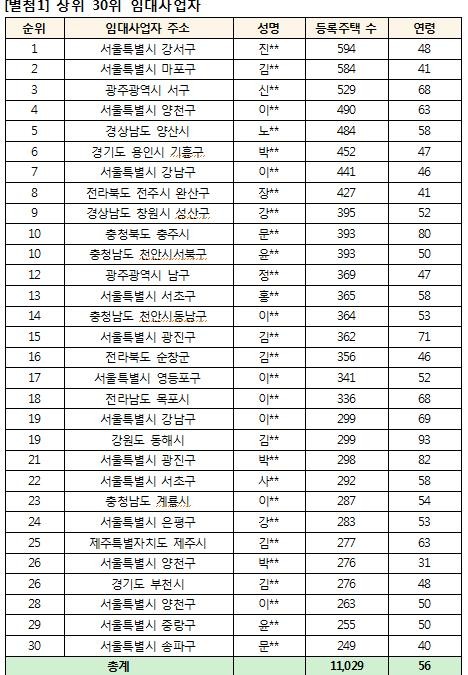 마포구의 40대(584채), 광주광역시 서구의 60대(529채)도 500채가 넘는 임대주택을 소유했고 이들 3명을 포함해 전국에서 18명이 각 300채 이상의 임대주택을 운영하고 있었다.