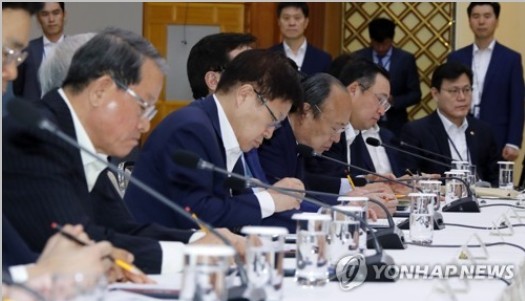 ▲ 문 대통령 발언 메모하는 30대 기업 일본의 수출규제 조치와 관련한 대책을 논의하기 위해 10일 오전 청와대에서 열린 경제계 주요인사 초청 간담회에서 김영주 한국무역협회장(왼쪽 세 번째)을 비롯한 30대 기업 대표들이 문재인 대통령의 발언을 메모하고 있다. |