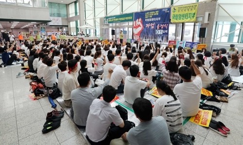 노조는 이날 오전 경기도 고양시 일산동구 국립암센터 본관 1층 로비에서 노조원 500여명이 참가한 가운데 파업 출정식을 진행했다.