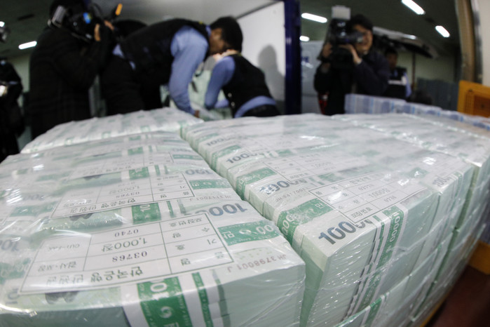 ▲ 설 연휴를 앞둔 20일 오전 서울 한국은행 강남본부에서 현금운송 관계자들이 설자금 방출작업을 하고 있다. 연합뉴스 제공