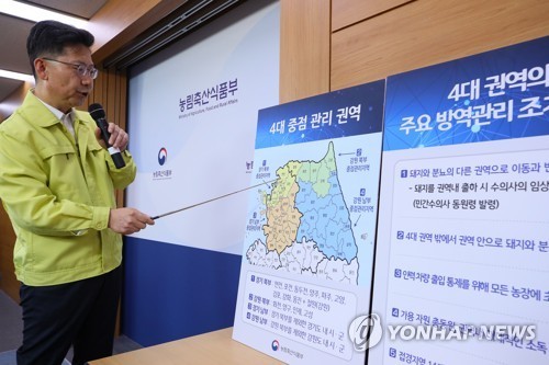 ▲김현수 농림축산식품부 장관이 24일 세종시 정부세종청사 농림축산식품부에서 아프리카돼지열병 중점관리지역을 경기·인천·강원 전체로 확대해 이동을 차단하는 방역관리 강화 대책에 대해 설명하고 있다.