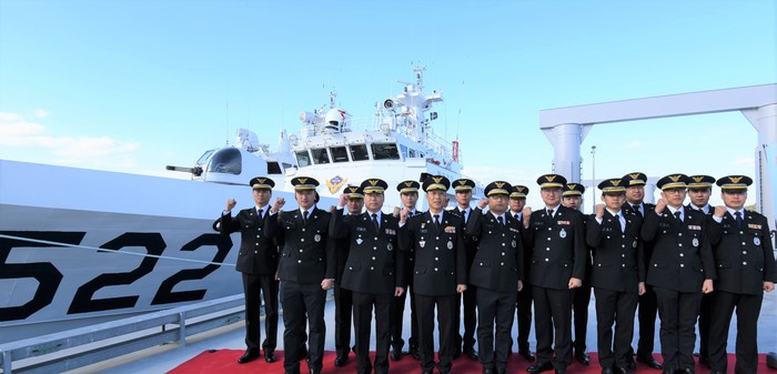 ▲ 지난 27일 오후 전남 완도군 완도읍 완도해경전용부두에서 최신예 중형 경비함 522함 취역식이 열리고 있다. 태극 22호는 무게 640t, 길이 63.2m, 너비 9.1m로 최대 속력 35노트(시속 65km)를 낼 수 있는 경비함이다. 완도해경 제공