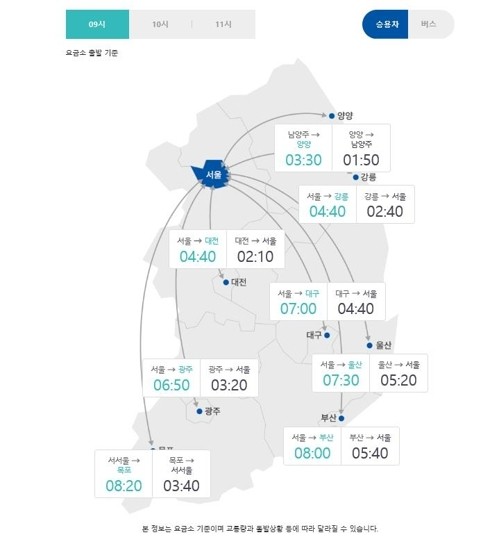 오전 9시 기준 주요 도시간 예상 소요시간