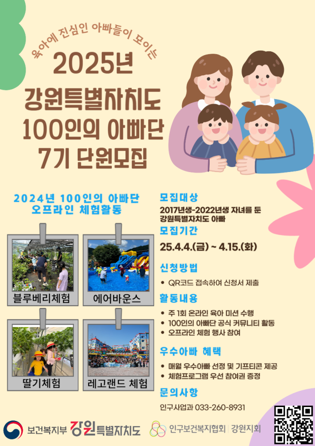 ‘100인의 아빠단’은 전국적으로 운영되는 보건복지부 지원 사업으로서 각 시·도 지회별로 지역 특성에 맞는 기획을 더해왔다. 광주시의 경우 2019년 시작해 매해 활동을 이어왔다. 강원지회 또한 이와 유사한 맥락에서 수년간 운영되고 있다. 단원으로 선정되면 온라인 육아 미션, 공식 커뮤니티 활동, 레고랜드 체험 등 오프라인 체험 프로그램이 제공된다. 이외에도 매달 우수 아빠 선정, 선물 및 프로그램 우선 참여 혜택 등이 마련된다.