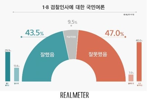 리얼미터가 CBS 의뢰로 지난 10일 전국 19세 이상 성인 502명을 대상으로 이번 검찰 고위급 인사에 대한 여론을 조사(95% 신뢰수준에 표본오차 ±4.4%포인트)한 결과, '잘못했다'는 부정평가는 47.0%(매우 잘못했음 40.0%, 대체로 잘못했음 7.0%)로 집계됐다.
