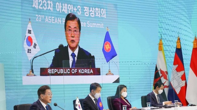 | ▲ 지난해 11월 열린 '아세안+3' 화상 정상회의에서 의사 발언중인 문재인 대통령/ 사진= 청와대 제공. |