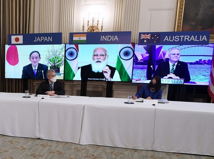 13일 미국 워싱턴 백악관의 다이닝룸에서 열린 온라인 정상회의는 조 바이든 미국 대통령을 비롯해 스가 요시히데 일본 총리와 나렌드라 모디 인도 총리, 스콧 모리슨 호주 총리 등이 참석해 현안을 논의한 것으로 전해진다.
